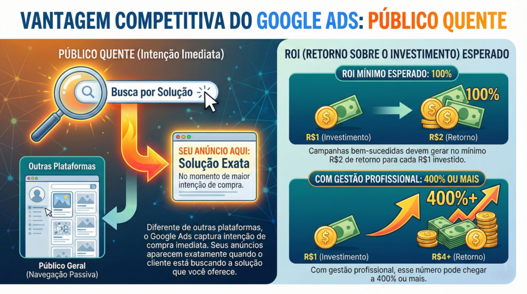 Quer alcançar clientes no exato momento em que eles estão procurando pelos seus produtos ou serviços? O Google Ads é a ferramenta mais poderosa para isso. Criamos e gerenciamos campanhas de tráfego pago que colocam sua empresa à frente da concorrência, atraindo um público qualificado e com alta intenção de compra.